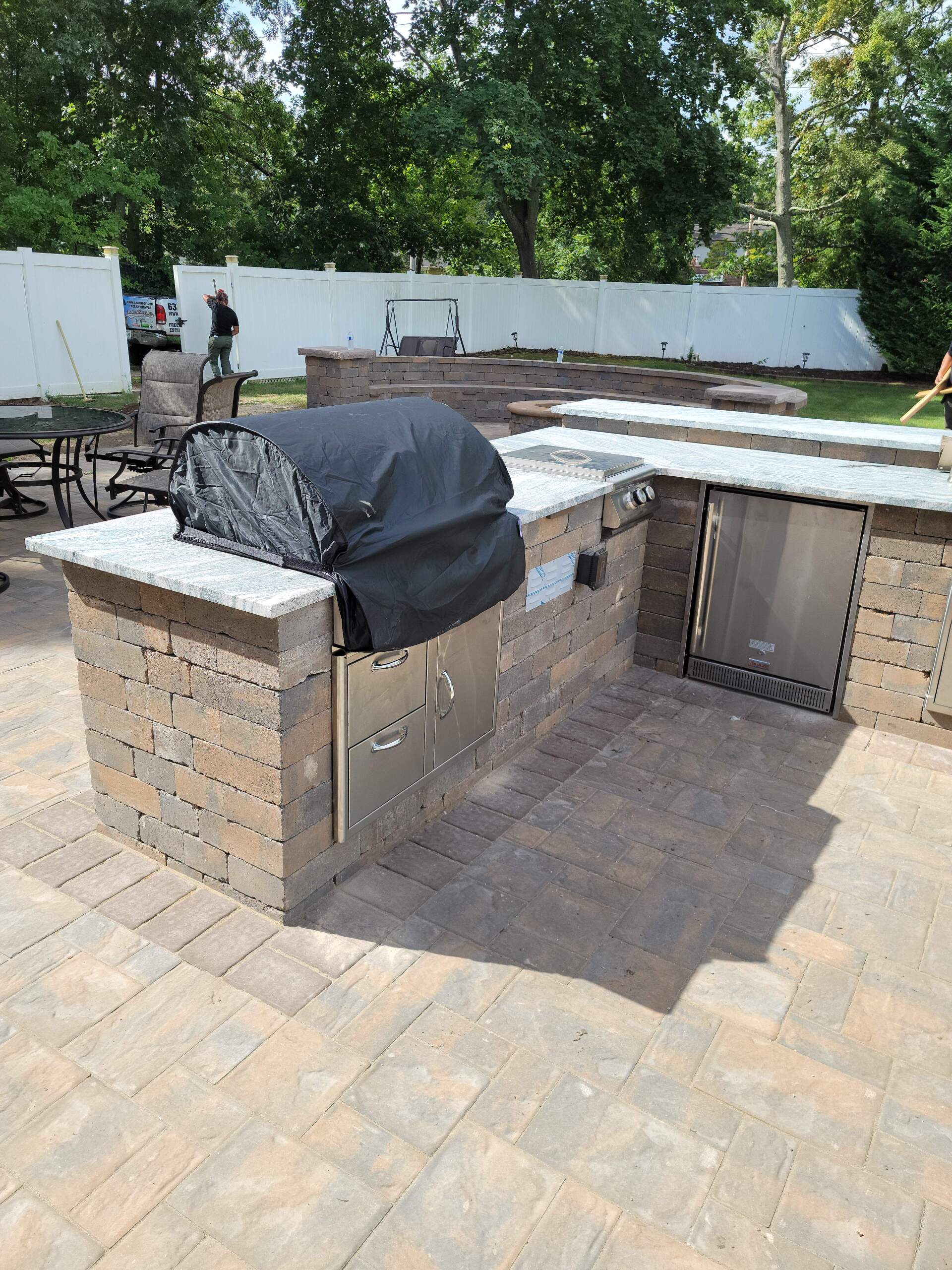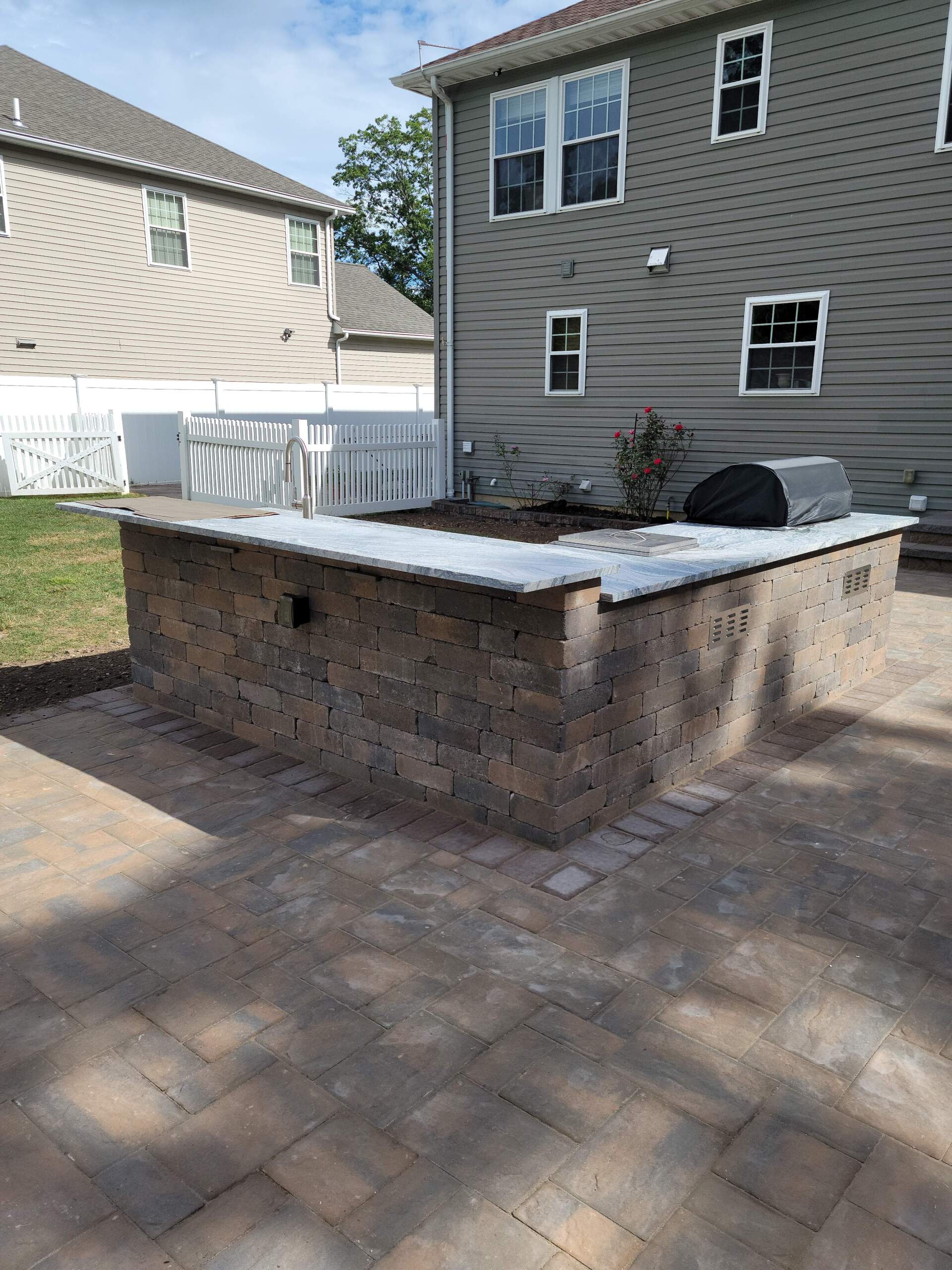 At On Time Paver Installers, we can help you create a customized outdoor kitchen that is perfect for your backyard space and cooking requirements. You can opt for a very simple and basic outdoor kitchen with some nice seating and a small dining table, or you can take it to another level by adding a beautiful countertop, a sink, an oven, a barbecue grill, and even a fire pit.